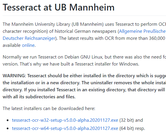 1. github.com/UB-Mannheim/tesseract/wiki 에서 tesseract.exe설치(32비트,64비트 중 하나 선택해서)