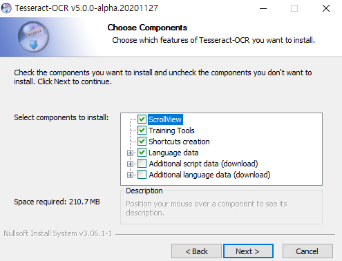 Additional language data 의 체크박스 옆에 +버튼을 눌러 Korean을 찾아 체크해주고 Next를 누른다.